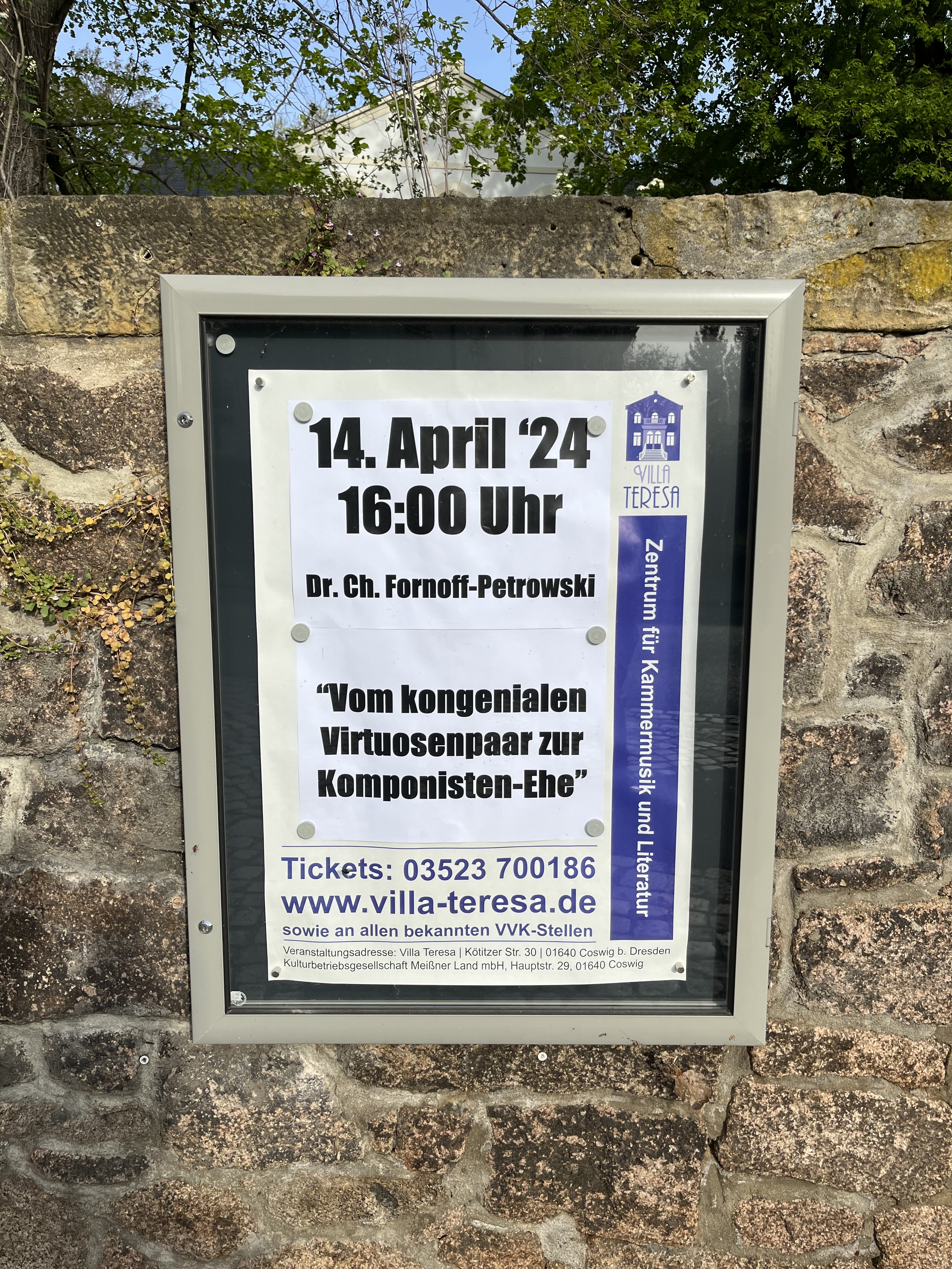 Im Rahmen der Jubiläumsveranstaltungen an der Villa Teresa in Coswig zum 160. Geburtstag des Pianisten und Komponisten Eugen d’Albert, hielt Christine Fornoff-Petrowski einen Vortrag mit dem Titel „Vom kongenialen Virtuosenpaar zur Komponisten-Ehe. Eugen d’Alberts Ehen vor dem Hintergrund seiner Künstlerentwicklung“. Eugen d’Albert hatte von 1891 bis 1895 mit der Pianistin und Komponistin Teresa Carreño, seinem Sohn, Carreños Kindern und den beiden gemeinsamen dort geborenen Töchtern in der Villa nahe Dresden gelebt. 1895 ließ sich das Paar scheiden und Eugen d’Albert heiratete die Sängerin Hermine Finck.